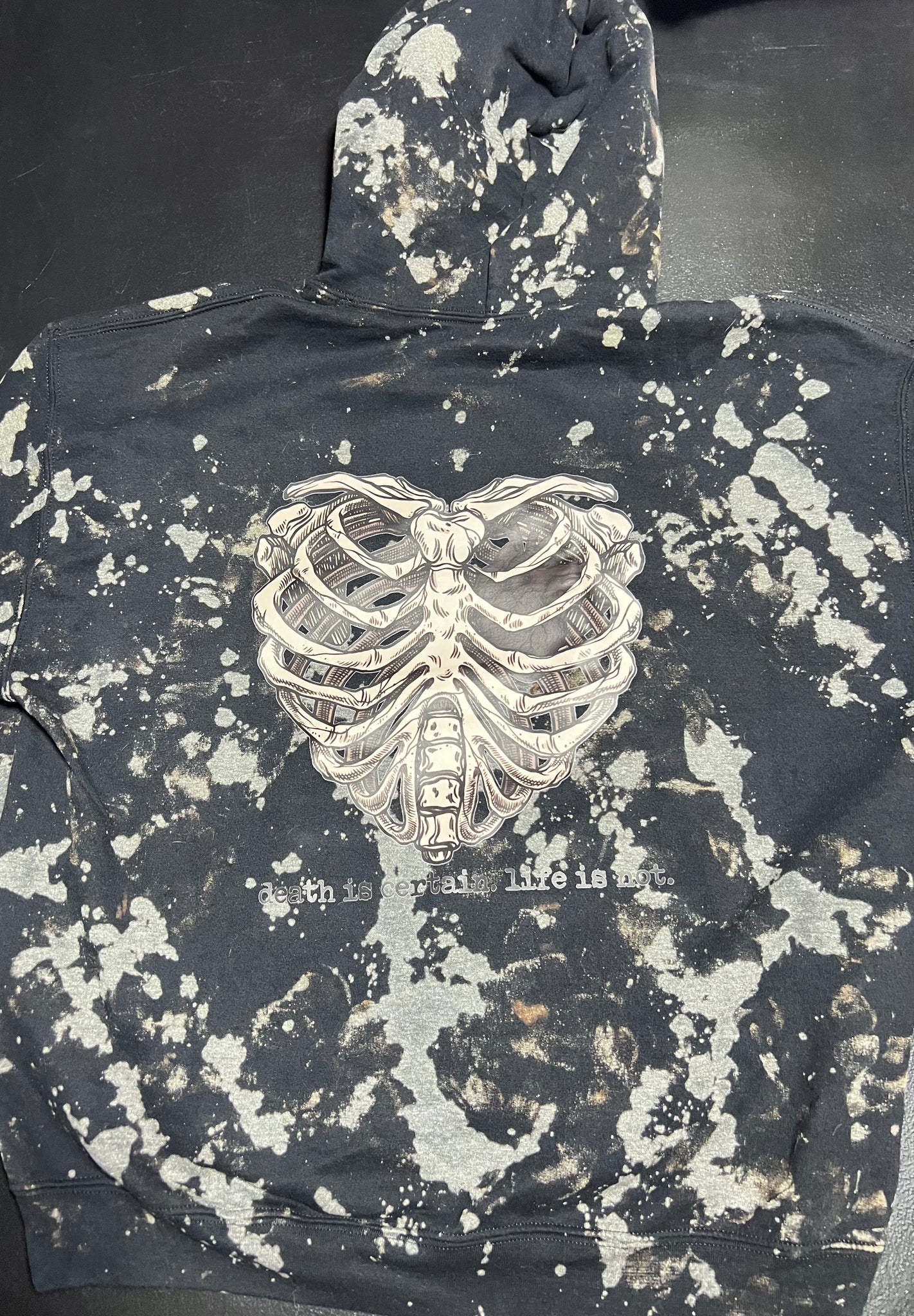 Take risks and make a statement with the Bleached Death Is Certain Life Is Not Hoodie. Featuring a daring design and bold bleaching, this hoodie is the ultimate wear for those who live life with no regrets. Dare to be noticed. Dare to stand out. Dare to live life to the fullest.